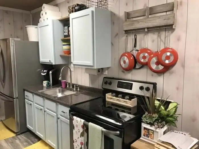 Кухня в этом крошечном доме включает в себя шкафчики, полноразмерные плиту, холодильник и мойку. Благодаря шкафчикам, окрашенным в небесно-голубой цвет, в комнате чувствуется простор и свет.