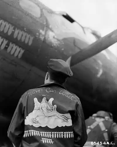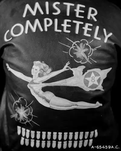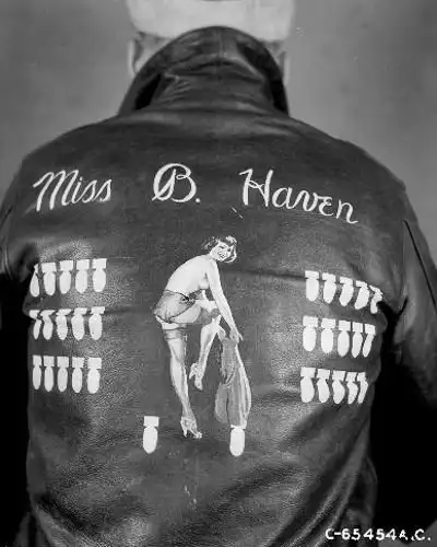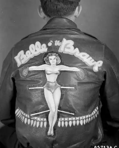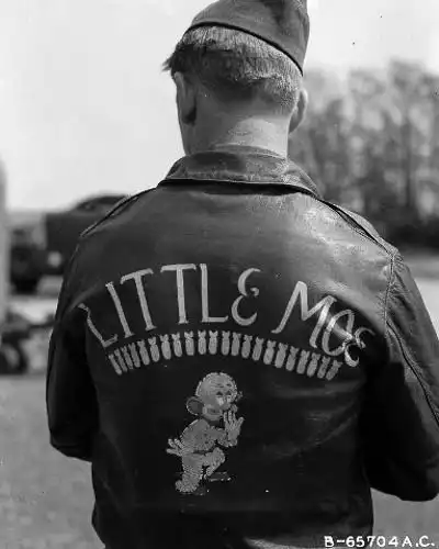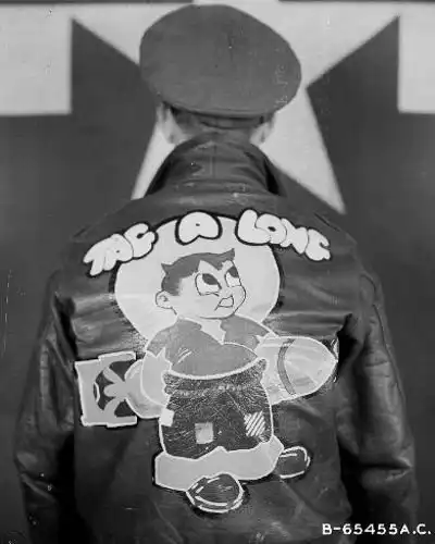С образом американских пилотов Второй мировой войны ассоциируются черные кожаные куртки, которые пилоты зачастую украшали рисункам. Куртки модели А-2 появились в 1931 году и стали выдаваться в качестве стандартной амуниции пилотам и штурманам. На некоторых куртках можно было встретить целые картины с изображением героев мультфильмов, девушек и бомб, означавших количество боевых вылетов. С примерами некоторых из таких рисунков нас с вами познакомит данный пост.