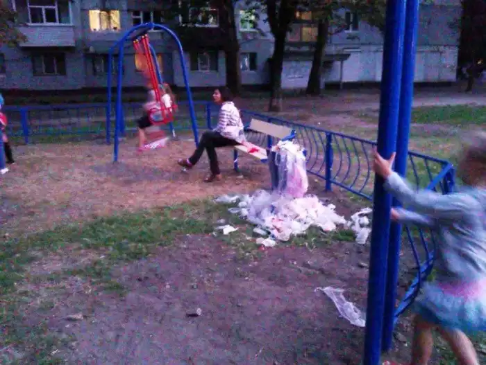 Конечно, виноваты те, кто завалил урну отходами, но мамам неужели приятно самим сидеть в такой грязи?