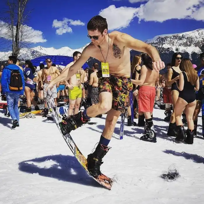 Лыжники и сноубордисты в купальниках на сочинском фестивале BoogelWoogel