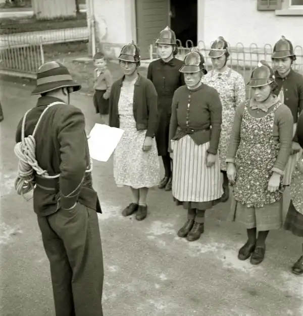 Но, когда мужчины поехали на фронт во время Второй мировой войны, женщинам пришлось занять их место на фабриках и заводах. И в качестве сварщиков, и в качестве токарей, и т.д. Встал серьезный вопрос о безопасности некоторых частей женского тела. Был разработан промышленный пластиковый бюстгальтер, который и демонстрирует эта девушка.