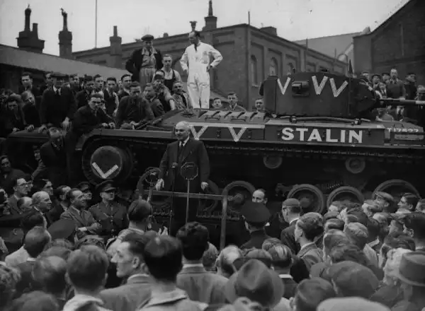 Фотография сделана 22 сентября 1941 года, когда на танковом заводе Birmingham Railway Carriage and Wagon Co. состоялся торжественный митинг, на который был приглашен советский посол Иван Майский. На фотографии «Валентайн» модификации Mk.II.