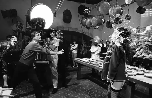 Бросает торт в лицо Натали Вуд, чтобы снять эпизод «Больших гонок»