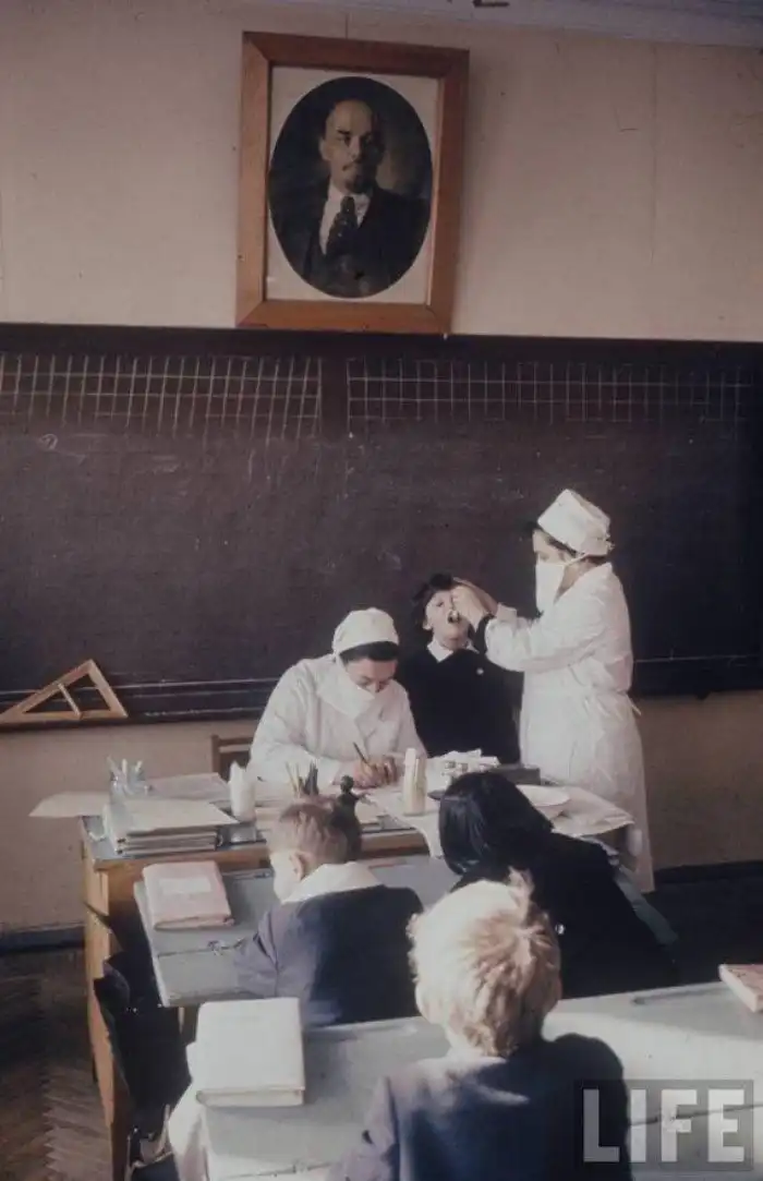 Одним из основных отличий социалистического типа медицины была возможность оказывать медуслуги «без отрыва от производства» – на заводе, в школе, на ферме или в каком-либо учреждении. На фото – вакцинация во время школьного урока, которую даже при большом желании ученику вряд ли удалось бы избежать.