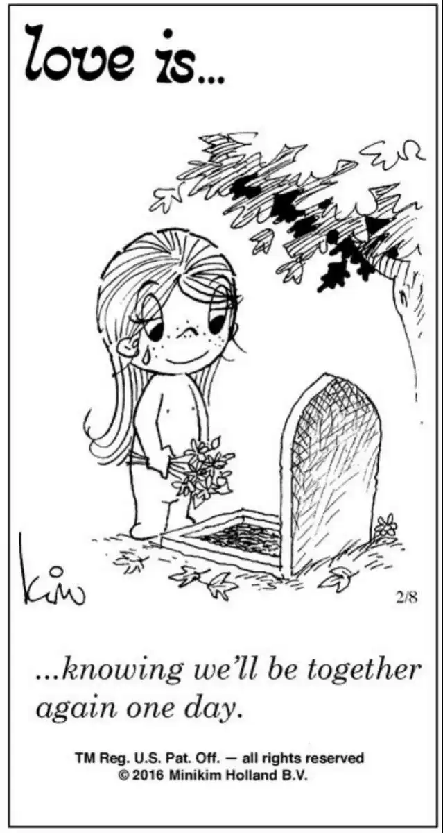 Ким умерла в 1997 году, но Бил Эспри продолжает рисовать (на протяжении 34 лет!) всё новые и новые истории о мальчике и девочке. И самое забавное, что всего несколько лет назад Билл узнал, что картинки из его комиксов размещаются в жевательной резинке Love Is. Дай бог, чтобы эта история любви между мальчиком и девочкой не закончилась никогда
