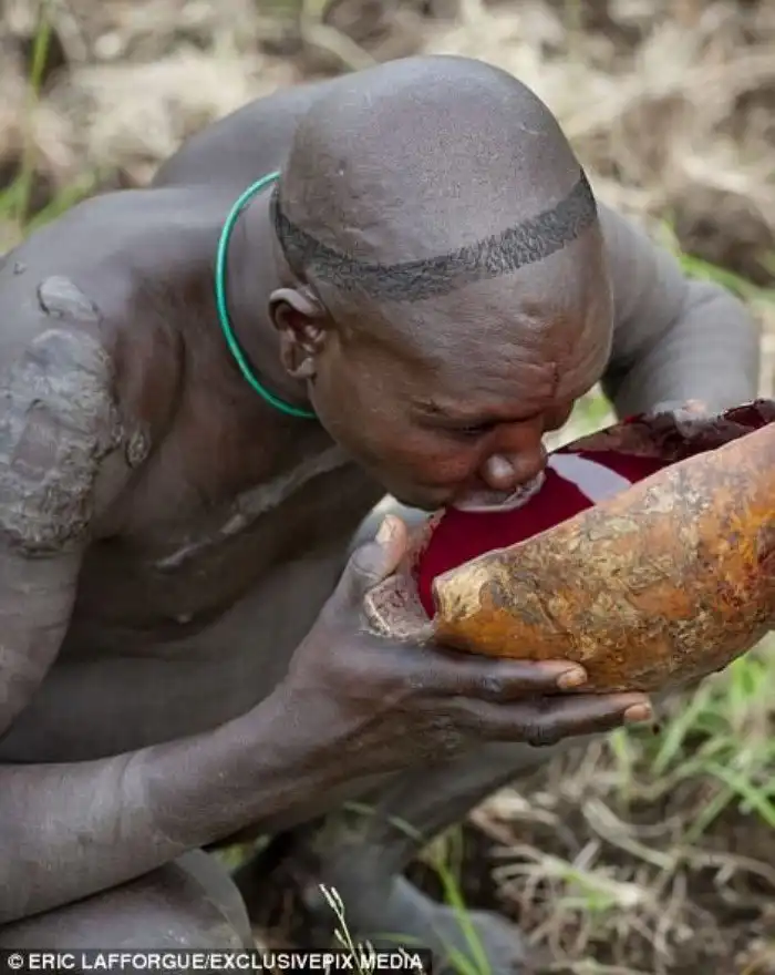 Перед битвой, чтобы подкрепить силы, бойцы пьют коровью кровь, которую нацеживают из живой коровы, сделав надрез в шкуре специальной стрелой.