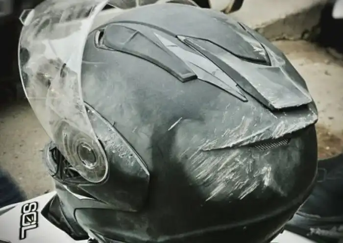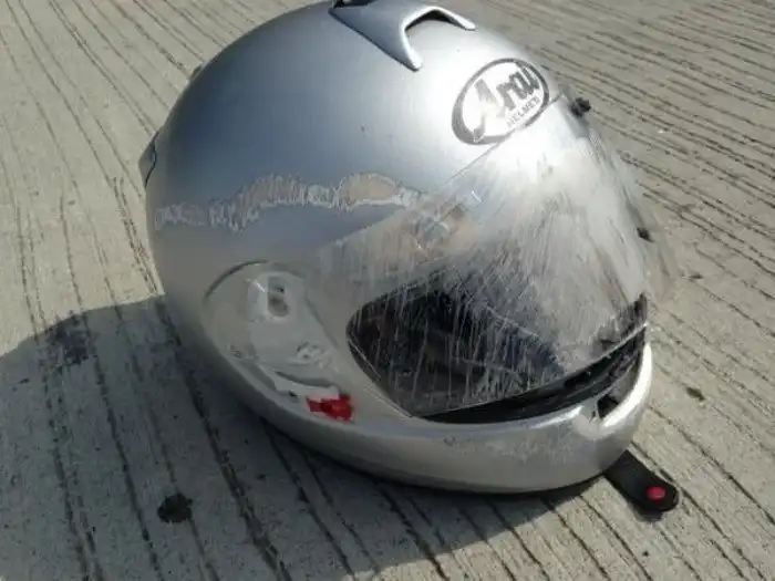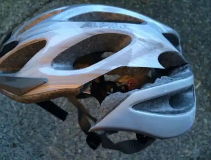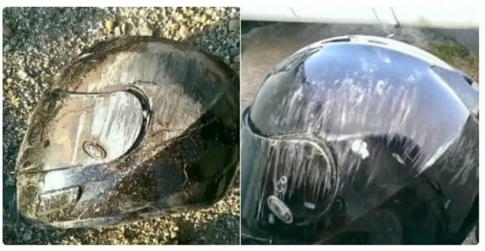 8. Автор этого фото утверждает, что ему в шлем "прилетел" кусок кирпича с впереди идущей машины. Более того — чудик всерьез верит в то, что шлем спас ему жизнь. ХА-ХА-ХА лох, от кирпича не смог увернуться на скорости, ЛОЛ!
