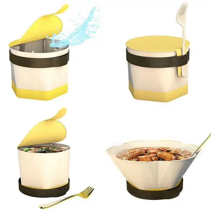 Удобная закрывающаяся крышка, место для вилки и возможность сделать из компактной упаковки более широкую миску