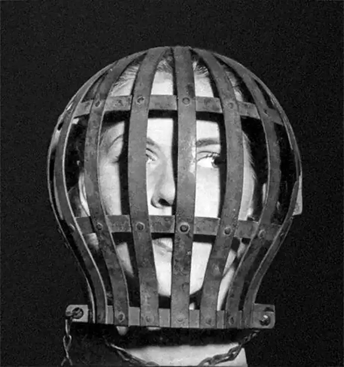 Перед вами не иллюстрация к роману Дюма «Железная маска». Это — средство защиты душевнобольного в британском сумасшедшем доме в 1950-х годах. Средство представляет собой защиту головы «буйной» больной, чтобы в случае приступа истерии она не покалечила себя.
