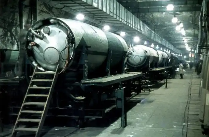 Топливные баки ракет Фау-2 (V-2) на сборочном конвейере в туннеле «Б» подземного завода Дора-Миттельбау, 1944 год.
