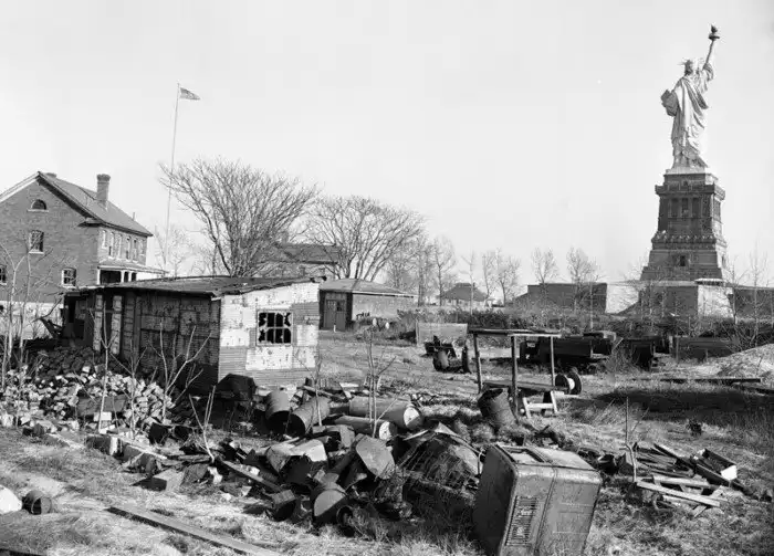 Статуя Свободы стоит среди мусора на острове Бедлоу в гавани Нью-Йорка, 5 марта 1948 года. Конгрессмены попросили Комитет по ассигнованиям Палаты представителей выделить 1 млн долларов для расчистки трущоб на острове.