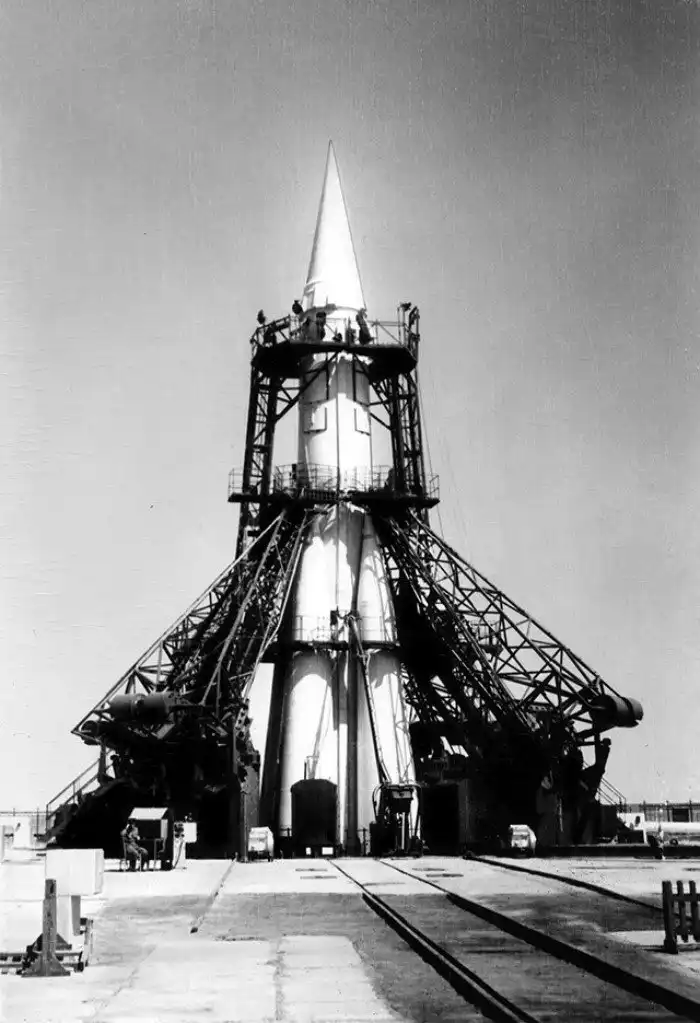 Ракета Р7 на стартовом комплексе перед первым удачным запуском, 21 августа 1957 года, СССР