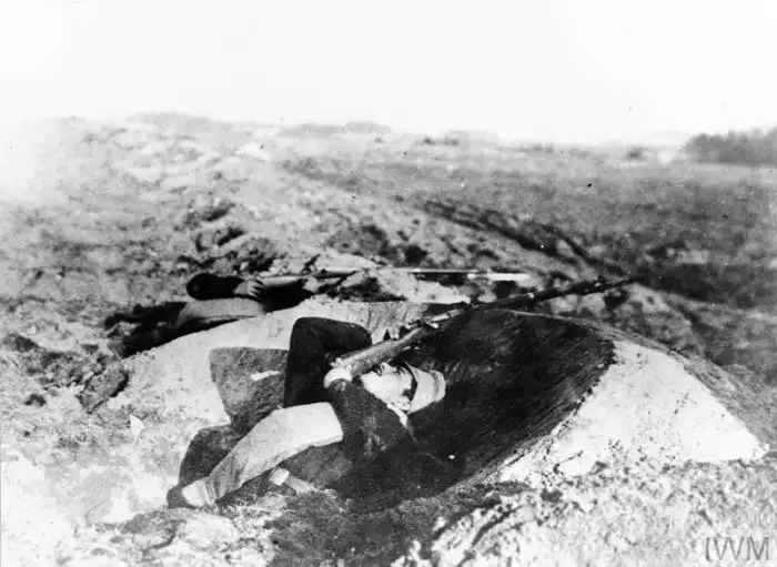 Русский солдат ведет стрельбу из окопа не подставляясь под ответный огонь, 1914 год.
