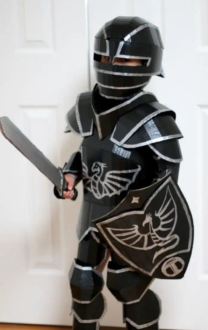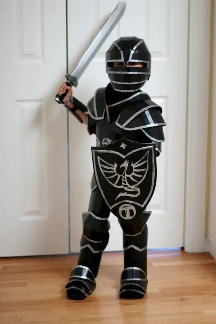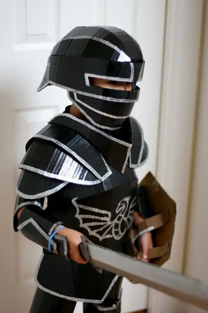 Все, абсолютно все основные элементы этой фентезийной реплики средневекового доспеха изготовлены из все того же картона. Казалось бы, дело несложное — до этого Уоррен сделал бесконечное число картонных мечей, топоров, кинжалов, наплечников и прочих игрушек. Но почти все они были, по сути, одноразовыми и примитивными. Здесь же ему предстояло соорудить цельный, полностью функциональный костюм, в котором ребенок сможет бегать и играть.