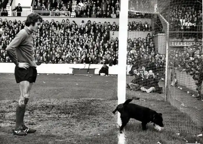 Голкипер "Ливерпуля" Рэй Клеменс терпеливо ждет, пока собачка выражает свое мнение о его игре,