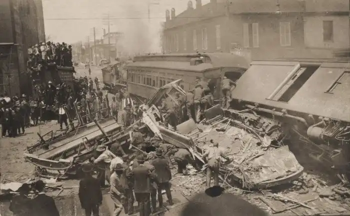 Последствия столкновения трамвая и поезда, Лексингтон, штат Кентукки, 1907 год.