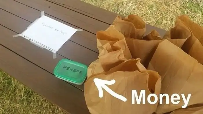 Перед вами столик самообслуживания, который находится у одной из норвежских ферм. Каждый желающий может приобрести здесь картофель, расфасованный в пакеты по 4 кг. Никаких продавцов здесь нет, все рассчитано на совесть покупателя, который сам забирает пакет и кладет в коробочку деньги.