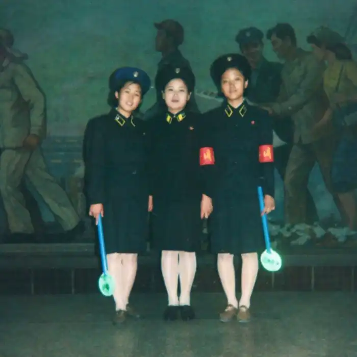 "Служащие пхеньянского метро. Обычно они похожи на роботов, но полароид заставил их улыбнуться".