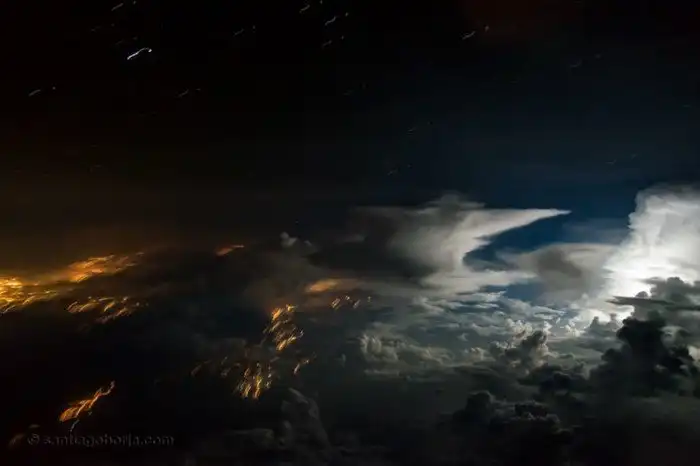 Пилот Сантьяго Борха Лопес работает в крупной авиакомпании Латинской Америки и во время рейсов нередко становится свидетелем разбушевавшейся стихии. Прямо из кабины авиалайнера эквадорец снимает потрясающие картины грозовых облаков и разрядов молний. Его фотографии поистине великолепны и неповторимы.