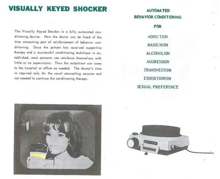 Трудно поверить, что еще в середине ХХ века этот прибор для самостоятельной терапии пользовался огромной популярностью. В то время гомофобия была, скорее, нормой, чем исключением, и многие люди сами хотели избавиться от "неправильной" ориентации. Еще большее число людей поддавались давлению семьи. В таких случаях лечение у психиатра - к примеру, с помощью электрошока - часто дополняли домашней терапией с помощью вот такого небольшого прибора. Он совмещал в себе функции электрошокера и проектора. В то время, как проектор проецировал на стену соблазнительные картинки гомосексуально-эротического характера, шокер бил пациента током. Излишне говорить, что, кроме страданий для пациента, такая терапия никакой пользы не приносила.