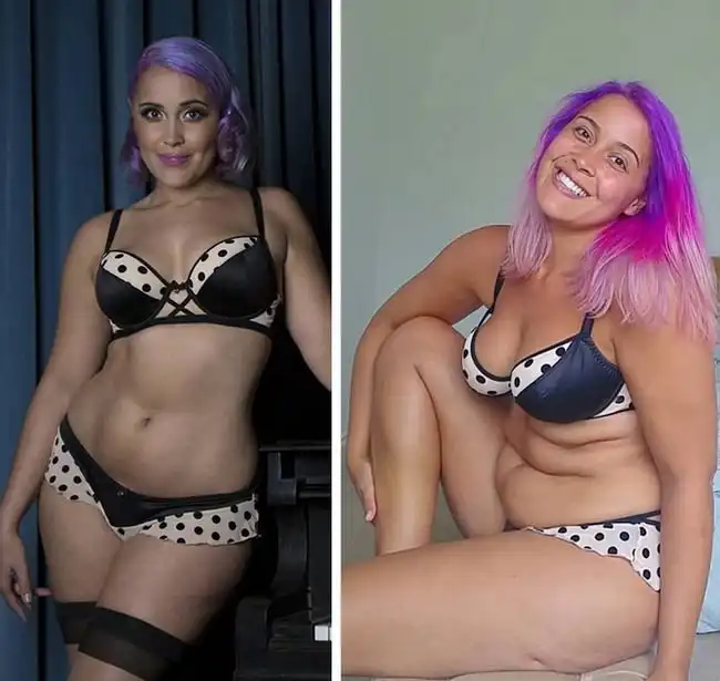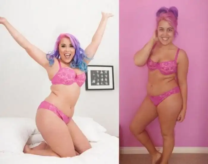 Модель размера плюс сайз Меган Крэбб (Megan Crabbe), ранее страдавшая от анорексии, а теперь продвигающая идеи «бодипозитива», недавно снялась в рекламной фотосессии для британского бренда нижнего белья Curvy Kate, после чего ее посетила новая идея. Девушка решила показать, что в реальной жизни модели выглядят вовсе не так, как на фото. Рекламные снимки являются результатом работы визажистов, стилистов и самих фотографов, которые зачастую пользуются фотошопом. Меган постаралась повторить кадры из фотосессии в реальной жизни, когда рядом нет всех тех специалистов, и вот, что из этого получилось.