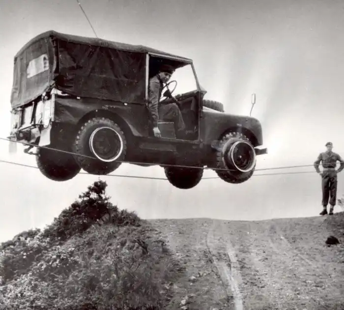 Британский Лендровер переправляется по системе, предложенной австралийцами (Royal Australian Electrical and Mechanical Engineers (RAEME)) по двум натянутым проволокам с помощью специальных насадок на колеса. Расстояние в этом случае - 110 футов, или 33,5 метров.