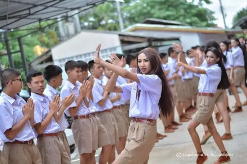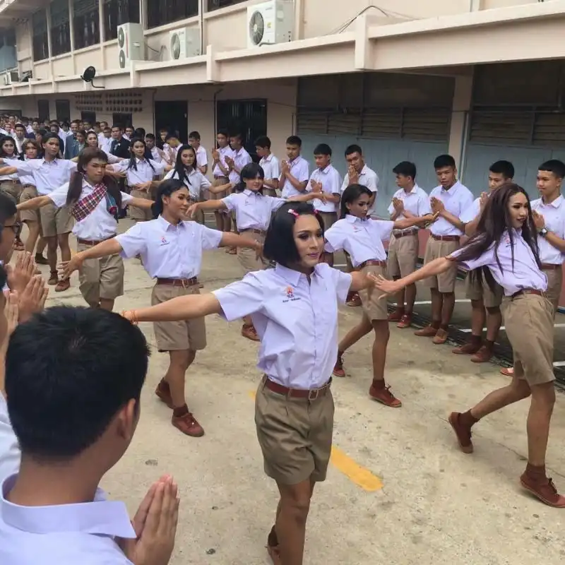 Пользователь Facebook выложил фотографии, сделанные в одной из школ провинции Чайяпхум в Таиланде. На снимках видно, как ученики рукоплещут танцующим в форме девушкам. Казалось бы, ничего необычного, если бы не один нюанс - плясуньи с длинными волосами и макияжем на самом деле мужского пола. Так детей поощряют выглядеть так, как им нравится.