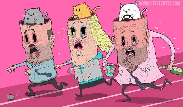 Лень, жажда наживы, обжорство, оболванивающее воздействие телевидения и интернета, эксплуатация людей, загрязнение окружающей среды… Британский иллюстратор Стив Каттс (Steve Cutts) выделяет худшее, что есть в современном капиталистическом обществе, и высмеивает это остроумными шаржами.