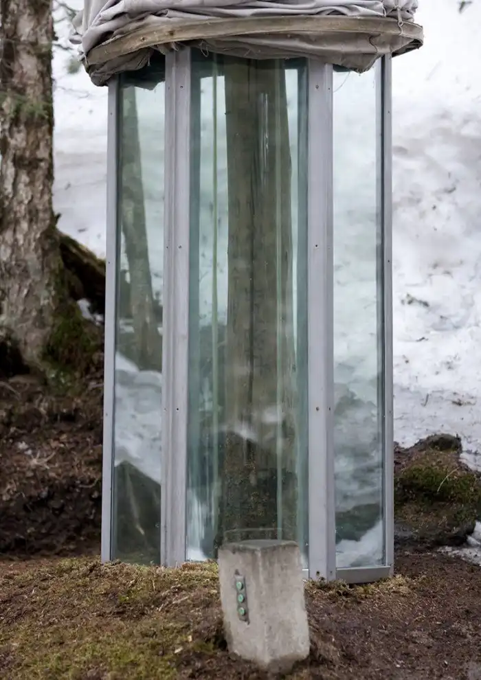 Некоторые надписи, вырезанные на стволах, для сохранности окружены стеклом - как эти лозунги "20 миллионов соотечественников гордятся звездой Пэктусана!" и "Ким Чен Ир - звезда, взошедшая в небе над Пэктусаном!" Обычно, кроме стекла, надпись защищают брезентовые занавески, но ради западного гостя гид подняла их, нажав на одну из зеленых кнопок на столбике внизу.