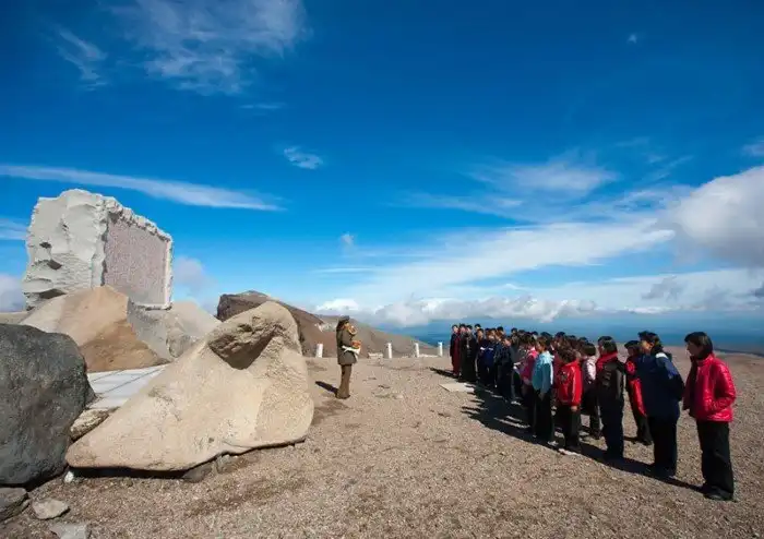 Стоя на вершине, студенты-экскурсанты выкрикивают лозунги. Самый популярный - "Станем колоннами и железными щитами, окружившими Пэктусан, и будем защищать его до самой смерти!" Некоторые явно мерзнут в слишком легкой одежде.