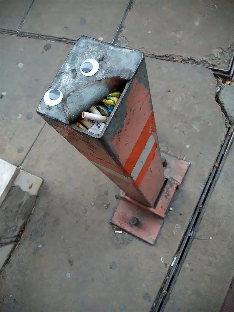 Именно этим и занимается уличный художник из Болгарии по имени Ваню Крастев (Vanyu Krastev), шатающийся по городу и вешая на сломанные городские элементы смешные глазенки. От деревьев и фонарных столбов до мусорных баков и пятен на тротуаре, Крастев доказывает, что даже самые обычные вещи можно сделать симпатичными и более интересными при помощи игрушечных глазок и фантазии!