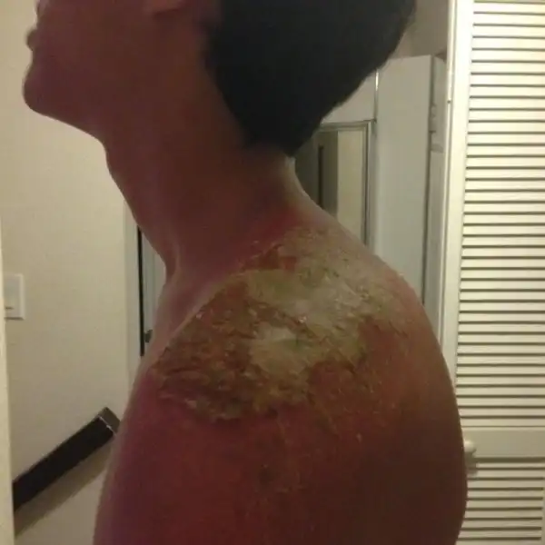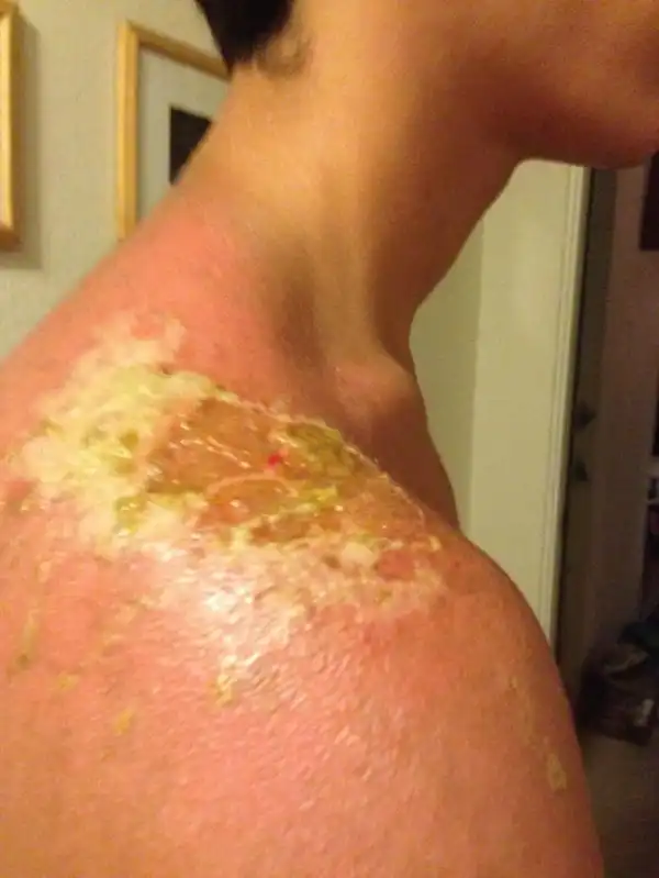 В преддверии летних отпусков стоит вспомнить о последствиях длительного пребывания на солнце. Один парень, позагоравший от души, получил сильнейший солнечный ожог. Его кожа покрылась пузырями, затем коростой и облезла, оставив внушительное пятно на спине.