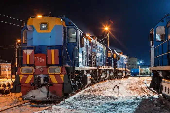 Поезд-водовоз. Две машины с водой и машина с топливом. Обычно в кабинах находится по «водителю», так как они ездят с заведенными моторами, чтобы груз не замерзал.