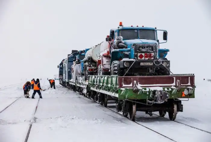 Это самая северная из действующих железных дорог в мире, проходящая полностью в зоне вечной мерзлоты, построенная «Газпромом» на полуострове Ямал.