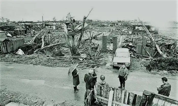В начале июня 1984 года в центральной европейской части страны после длительного периода высокого атмосферного давления установилась сухая и жаркая погода. Но 9 июня здесь столкнулись два атмосферных фронта, один из которых двигался с юго-запада, а другой - с севера. Столкновение двух воздушных масс привело к образованию не менее трех смерчевых воронок, которые обладали высокой разрушительной силой.