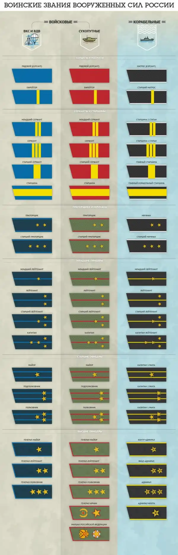 Наглядно о воинских званиях военнослужащих — войсковых и корабельных.
