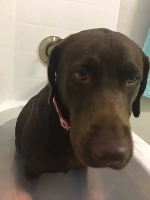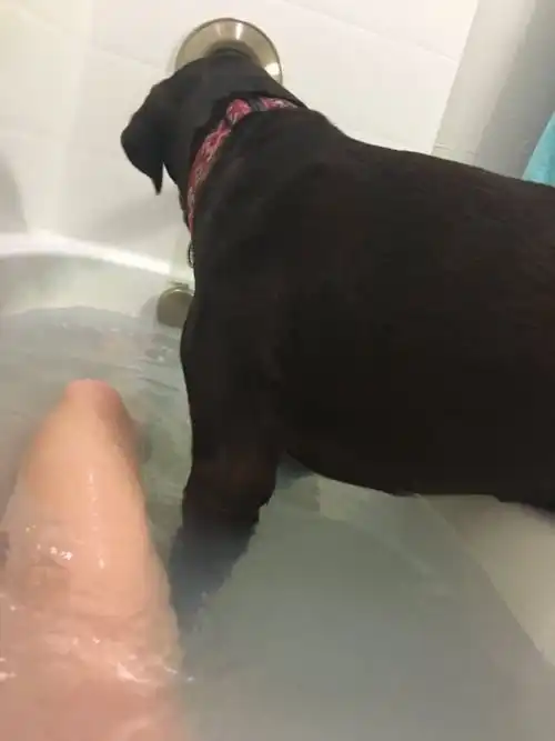 Собаки очень любят ходить за своими хозяевами и повторять все их действия, поэтому в том, что этому псу захотелось принять ванну, вслед за своей хозяйкой, нет ничего удивительного. Разумеется, девушка просто не смогла отказать своему питомцу, увидев, как он на нее смотрит. Судя по всему, эта собака добивается очень многого с помощью такого мощного приема, как просящий взгляд.