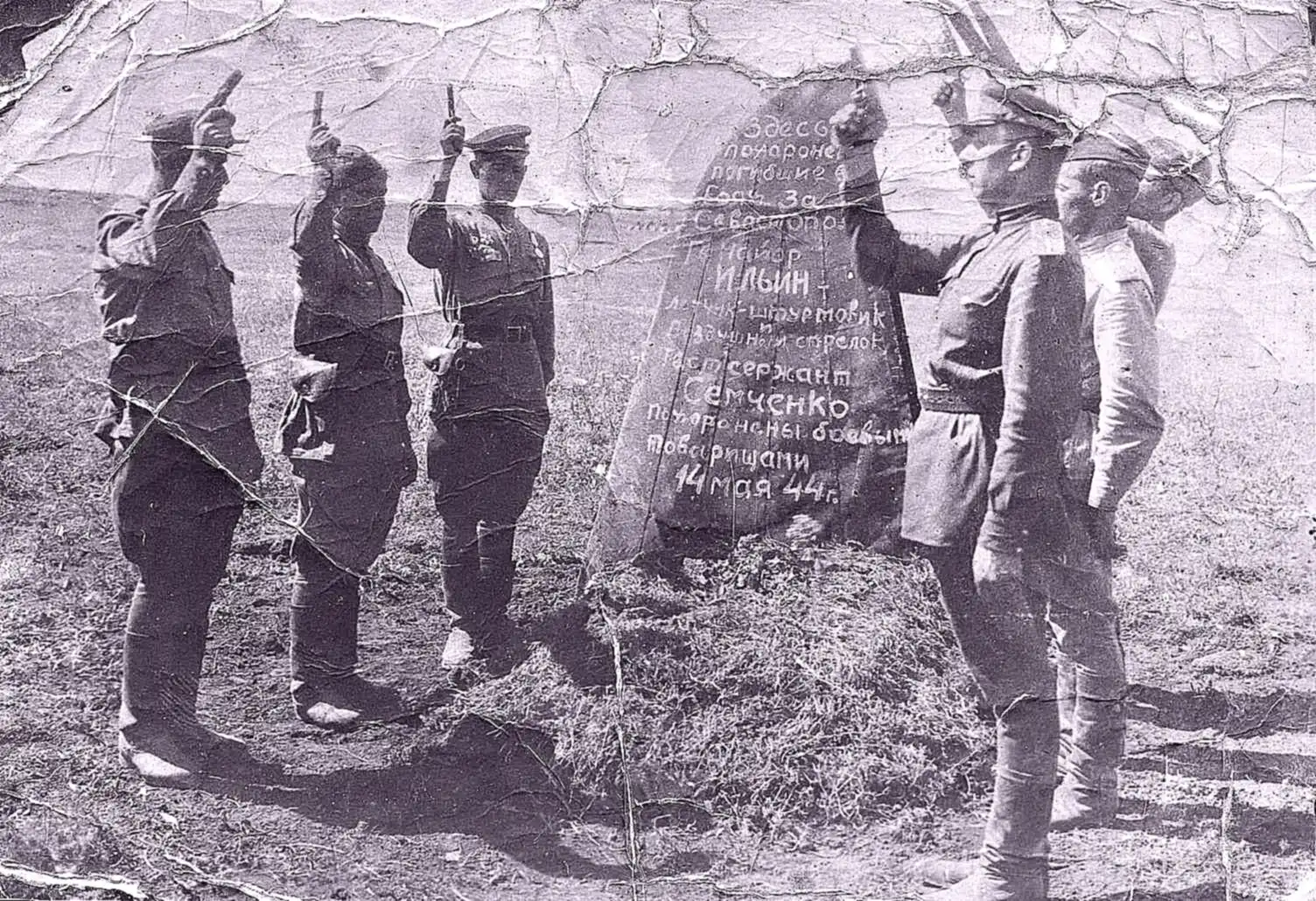 Надпись на надгробии из обломка стабилизатора самолета: «Здесь похоронены погибшие в боях за Севастополь гвардии майор Ильин – летчик-штурмовик и воздушный стрелок гвардии старший сержант Семченко. Похоронены боевыми товарищами 14 мая 1944 г.» Фото сделано в пригороде Севастополя 14 мая 1944 года.