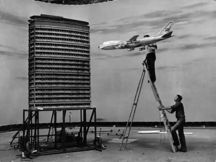 В павильоне спецэффектов и комбинированных съемок готовятся к съемкам эпизода авиакатастрофы для фильма «Прикосновение медузы»