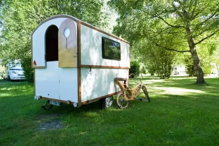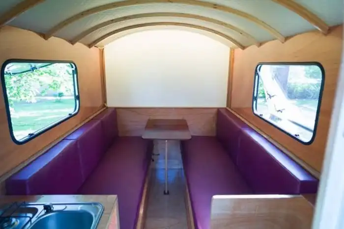 Этот компактный трейлер отлично подойдет для тех, кто любит путешествовать, но при этом не нуждается в максимальном комфорте. Компактный фургон включает в себя только все самое необходимое: кровать, трансформирующуюся в два дивана и стол, а также раковину и небольшую плиту для приготовления пищи. Прочих излишеств здесь нет, а потому трейлер получился очень легким и транспортировать его может практически любой автомобиль.