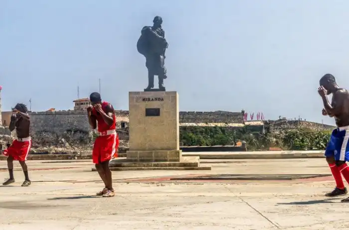 Кубинские боксеры занимаются спаррингом на Малеконе перед статуей Франциско де Миранды — венесуэльского революционера, который считается основателем латиноамериканского движения за независимость
