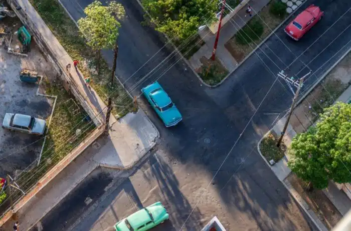 Старые машины проезжают мимо разрушающихся прямо на глазах зданий