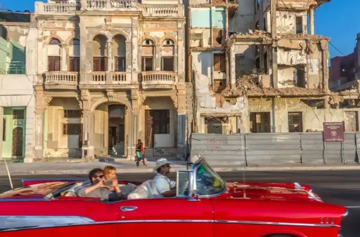 Такси с туристами проезжает мимо разрушенного здания на Малеконе