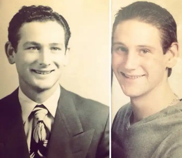 Глядя на эти фотографии близких родственников, волей-неволей поверишь в переселение душ! Потому что, хотя родственного сходства никто не отменял, люди на снимках не просто похожи на своих отцов, матерей и дедов - их сходство просто поражает! Кажется, перед нами одно лицо, проникшее сквозь время!
