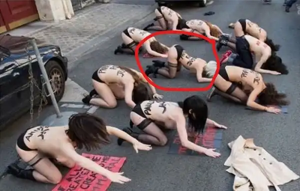 Если внимательно присмотреться ко всем этим девушкам, то вы заметите, что одна из них отличается от других. Возможно, она является агентом, работающим под прикрытием среди феминисток. Принимая участие в массовой акции протеста, наша героиня выделяется на фоне других девушек, хотя полностью повторяет их действия. Для тех, кто так и не догадался, о какой девушке идет речь, ответ под фото.
