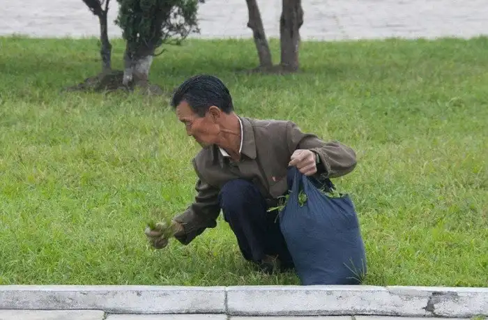Этот человек не разводит кроликов и не держит козу. Он собирает траву с газона, чтобы приготовить поесть себе и своей семье. Дефицит многих продуктов и тотальная бедность населения в Северной Корее приводят к тому, что в сельской местности царит настоящий голод, и обычная трава для многих корейцев - вполне лакомое повседневное блюдо.