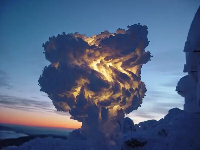 Уличный фонарь, покрытый слоями льда и инея. Гора Вашингтон, штат Нью-Гэмпшир, США