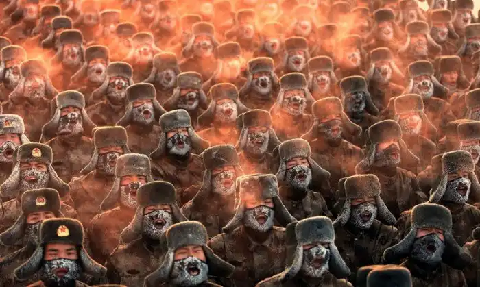 Китайские солдаты делают дыхательные упражнения при -28 градусах