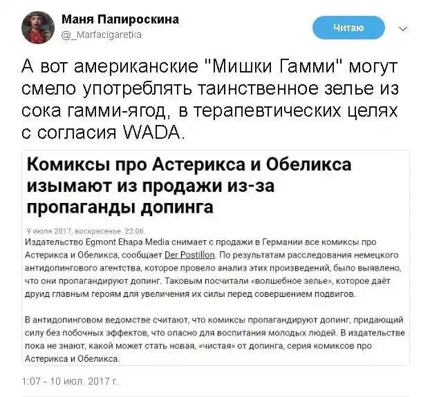 Про комиксы об Астериксе и Обеликсе это серьёзно?! Если так, то это уже клинический синдром какой-то, пора уже психиатрам серьёзные проверки провести среди истеблишмента спорта-политики