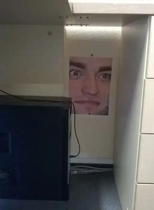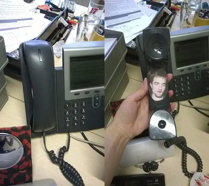 Девушка рассказала своим коллегам, что очень не любит актера Роберта Паттинсона, сыгравшего главную роль в саге "Сумерки". Коллеги учли это и именно на этой неприязни к конкретной личности основали свой розыгрыш. Теперь нелюбимый актер будет в течение всего дня преследовать девушку, которая ни о чем не догадываясь придет с работы и сидят на свое рабочее место.